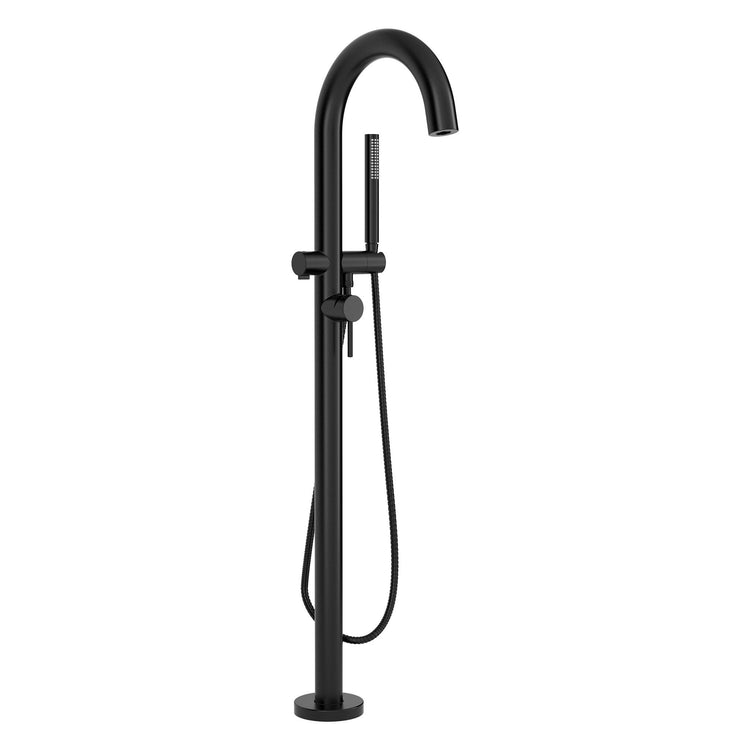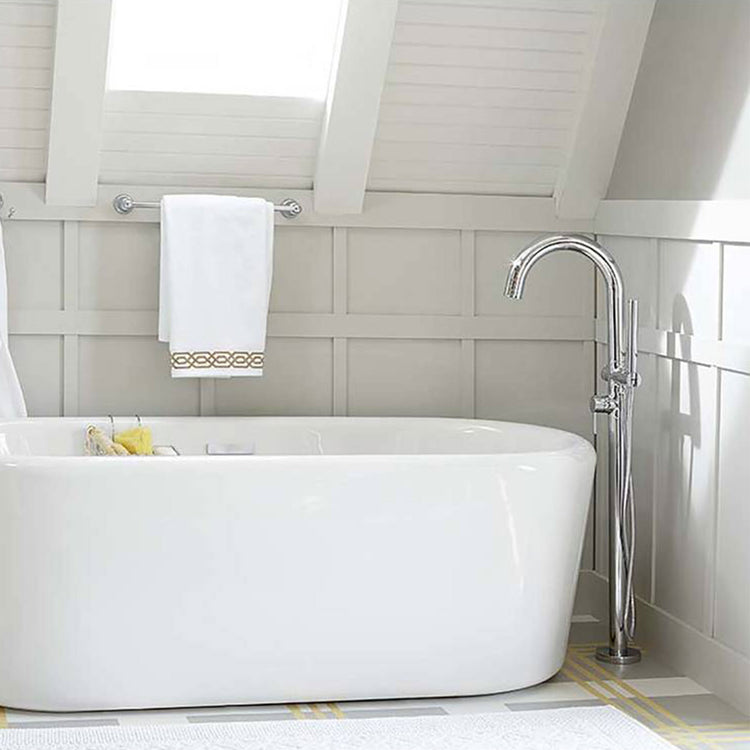 Add enduring style and superior performance to your bathroom design with the Contemporary Round Freestanding Tub Filler with Hand Shower. Combining the best of form and function, it features a minimalistic arched faucet, lever handle, and sleek, personal shower for rinsing off, bathing little ones, and cleaning the tub with ease. Available in 2 lustrous finishes to coordinate with faucets and accessories. Trim and rough valve sold separately.