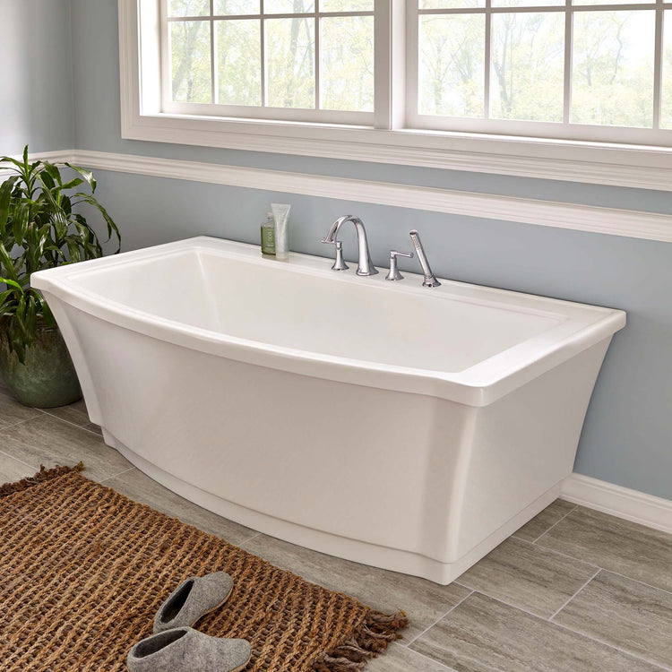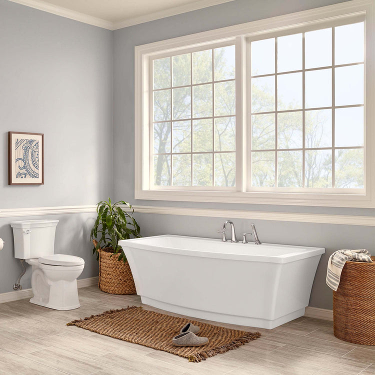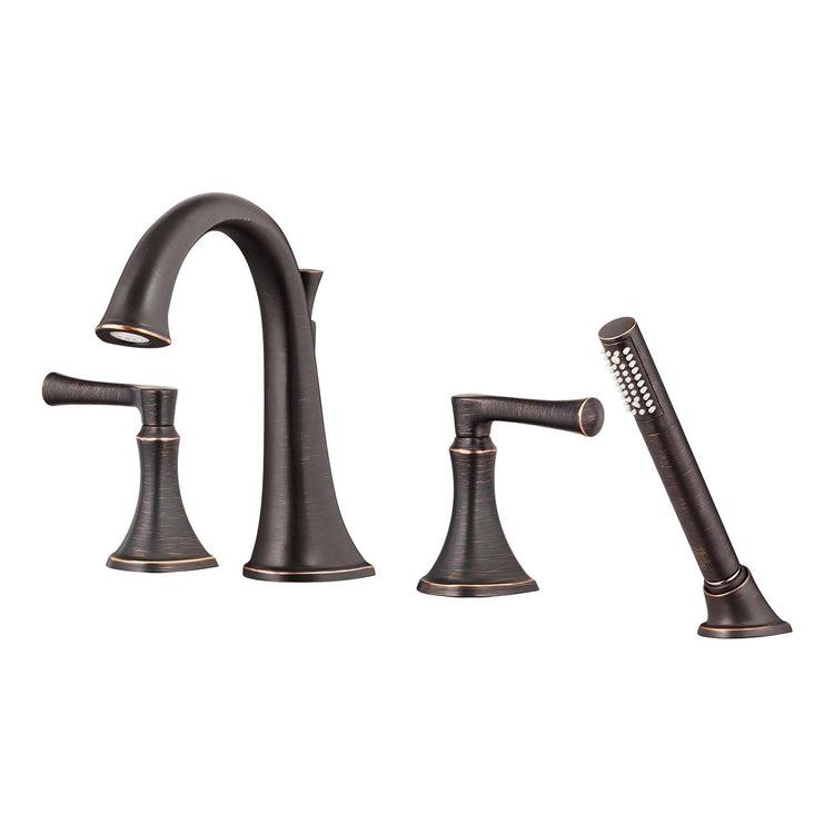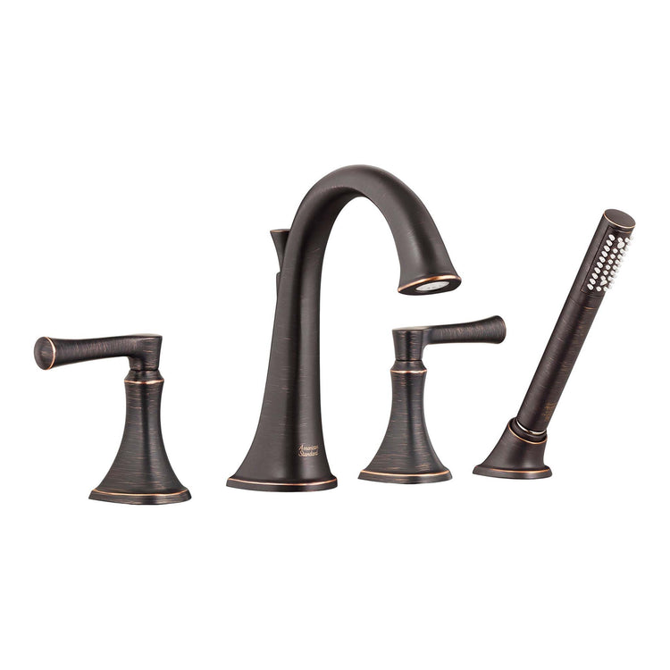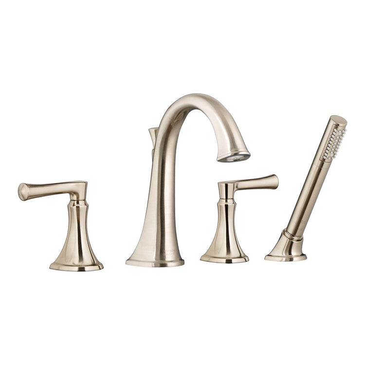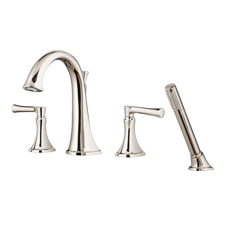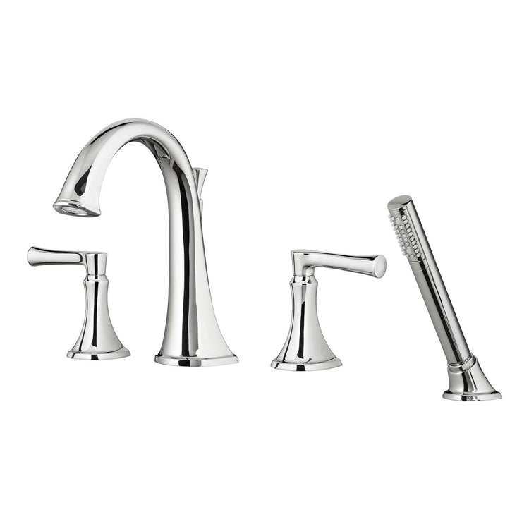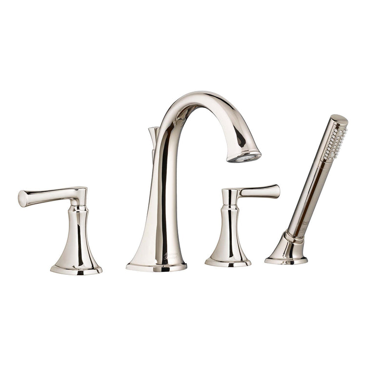 For modern elegance or casual flair, the sleek Estate Roman Tub Filler with Hand Shower makes an impressive statement. Featuring clean lines, a gracefully arched spout, easy-to-grasp lever handles, and personal shower, it’s engineered for superior performance in today’s home. Available in 4 tarnish- and scratch-resistant finishes to coordinate with the entire collection. Trim kit and rough valve sold separately