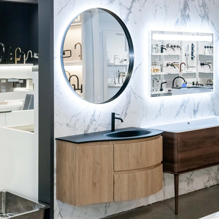 The versatility of the Olimpia Collection is enhanced by integrated washbasins in resin, extra light white glass, satin matt black or countertop in white or colored ceramic, in the single or double bowl version. The Collection is completed by a wide range of equipped cupboards and multifunctional backlit mirrors with touch system, bluetooth and dimmer for regulating the intensity and colour of the light to offer the widest design freedom.