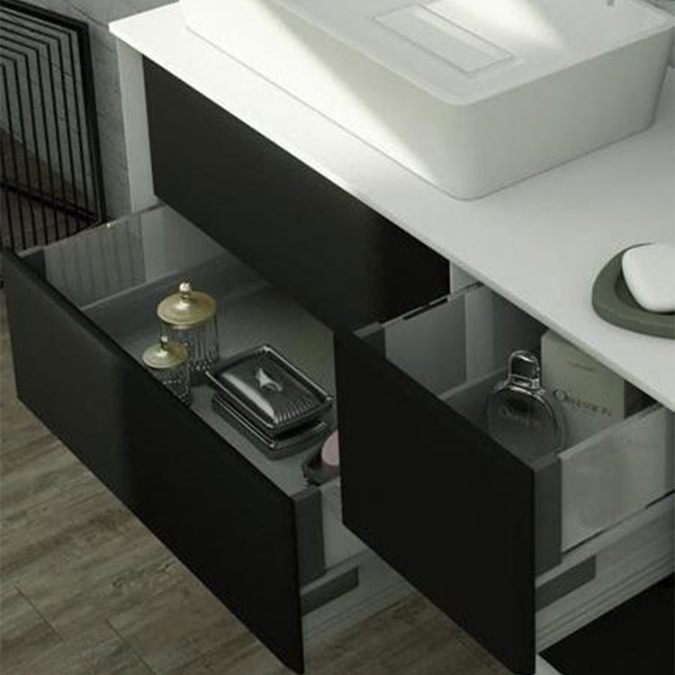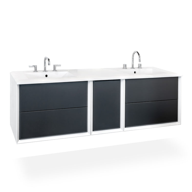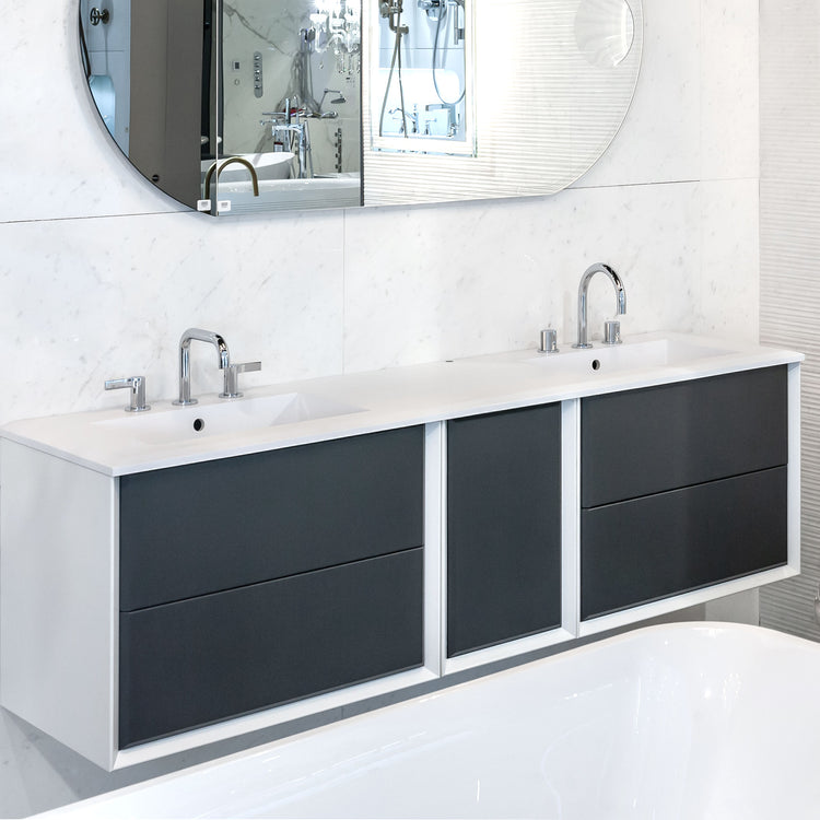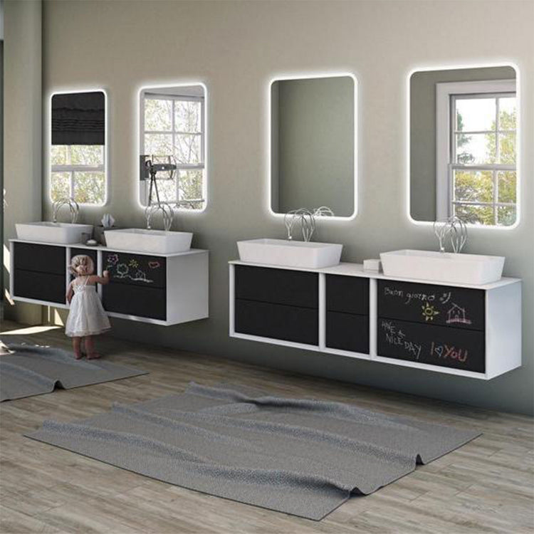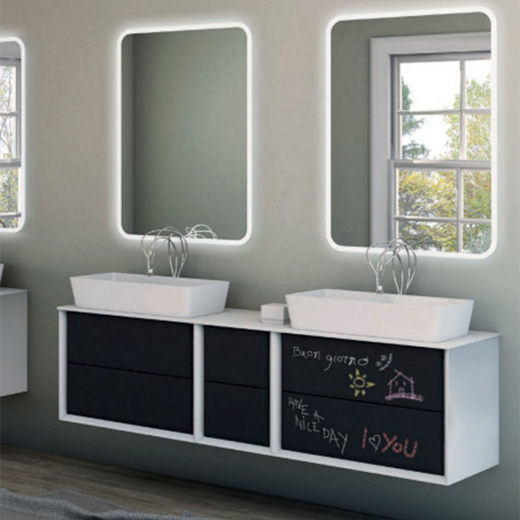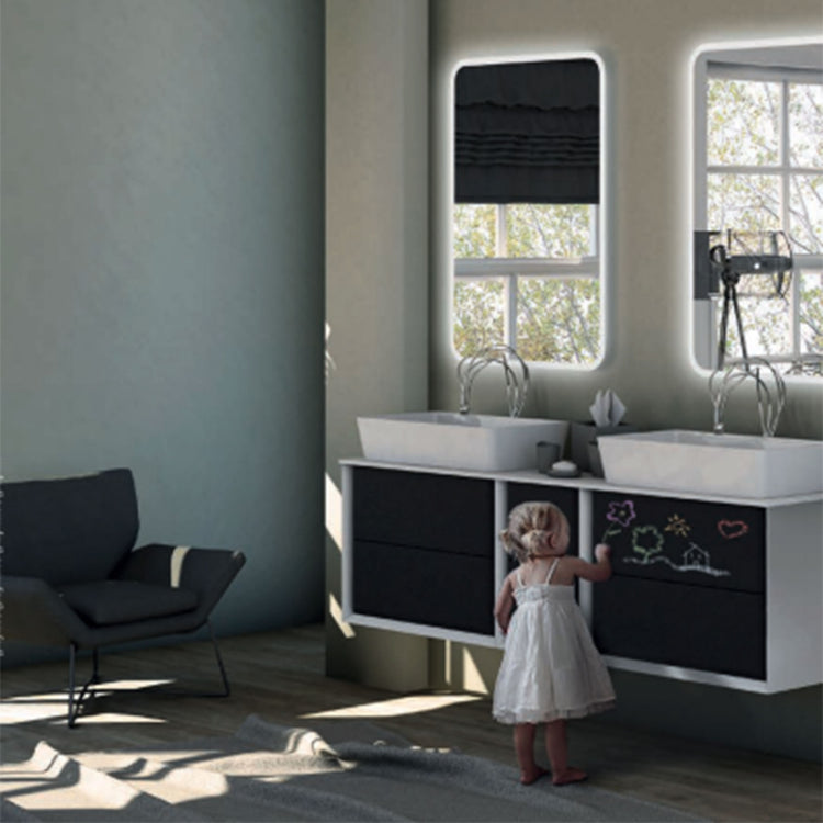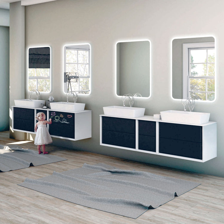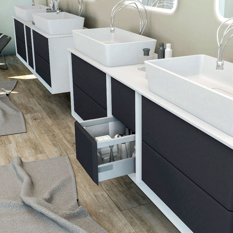A new graphite colour with blackboard effect Collection gives a personal space in which write, draw, or just express the own creativity. The new version provides not only counter top washbasin but also integral washbasins in solid surface, it has practical drawers with BLUM metal system with glass infill, a system of push opening and soft closing and it's today available in addition to the variants matte white and tobacco oak, also marble glass finish, giving to Bellagio Collection elegance and versatility for every bathroom environment.