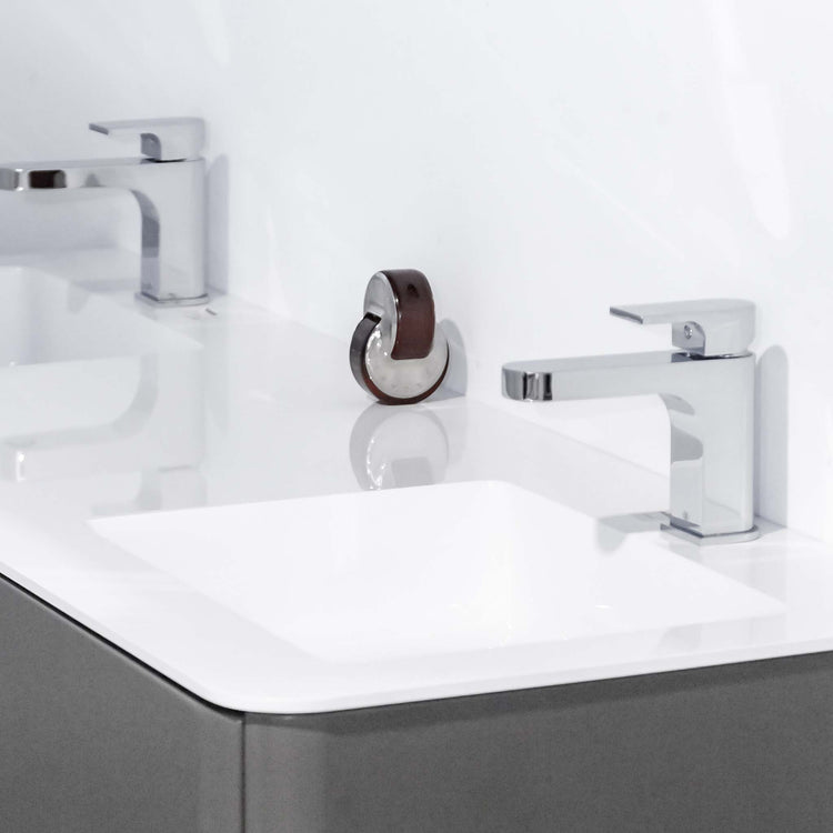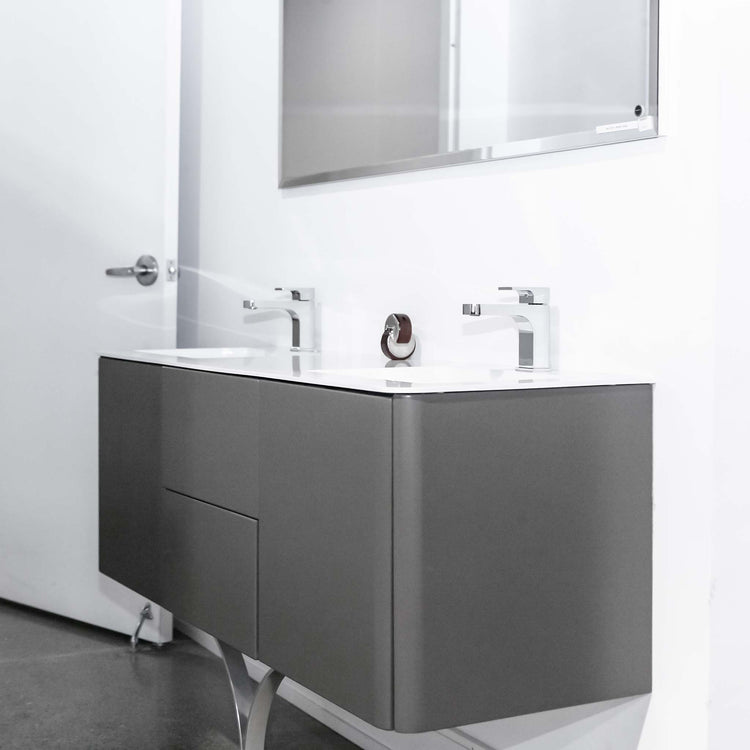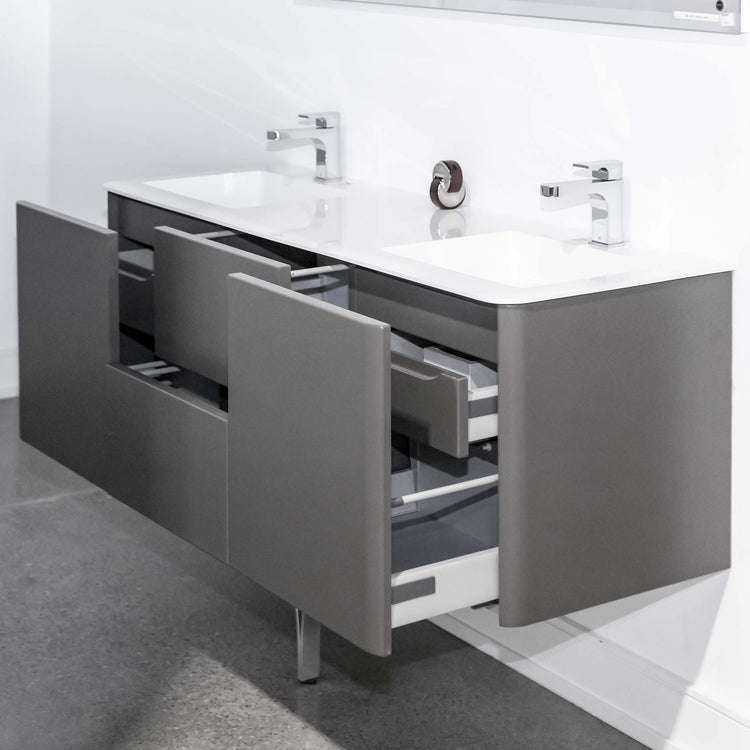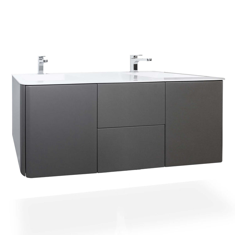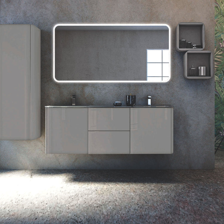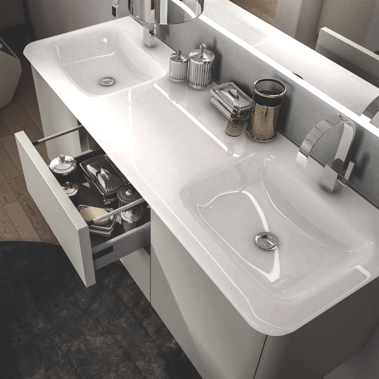 New design and functionality for the Liverpool line: a container cabinet with rounded sides that resemble the top of the top integrated in extra light crystal, multifunctional drawers with practical push system and sliding closure where technological function and aesthetic component cleverly melt.