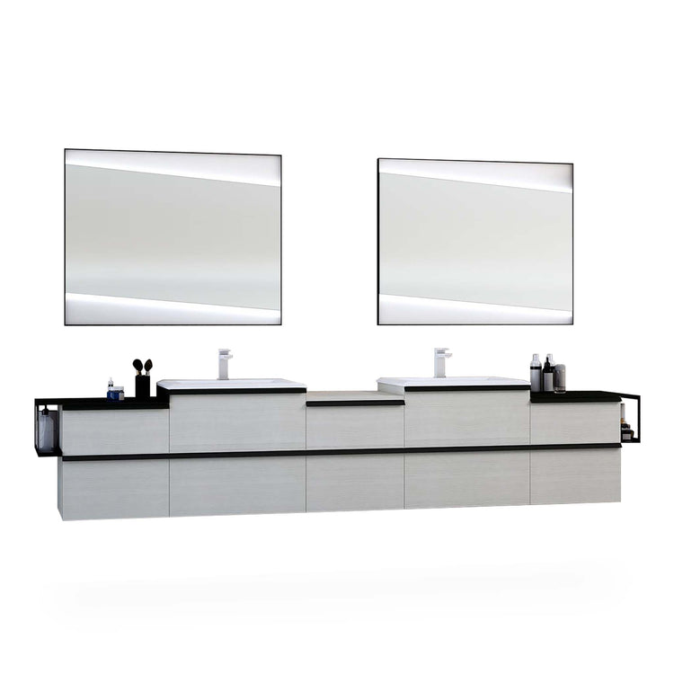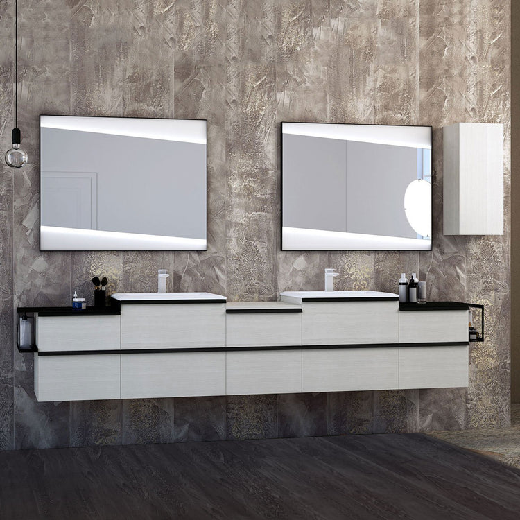 Available in two wood finishes, Bruges Oak and White Rock, the Collection is based on the simplicity of the lines enhanced by 45-degree gleanings and the functionality of the countertops, available in wood or metal finish with the practical side accessories. The cubes in black plate and the wooden wall units, combined with the profiled metal mirrors with integrated double LED, complete the Qubo line, giving it the dynamism and versatility of the industrial style.