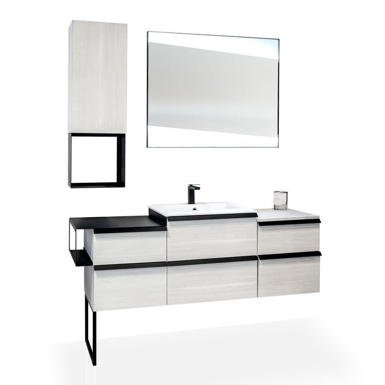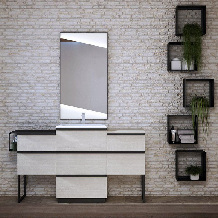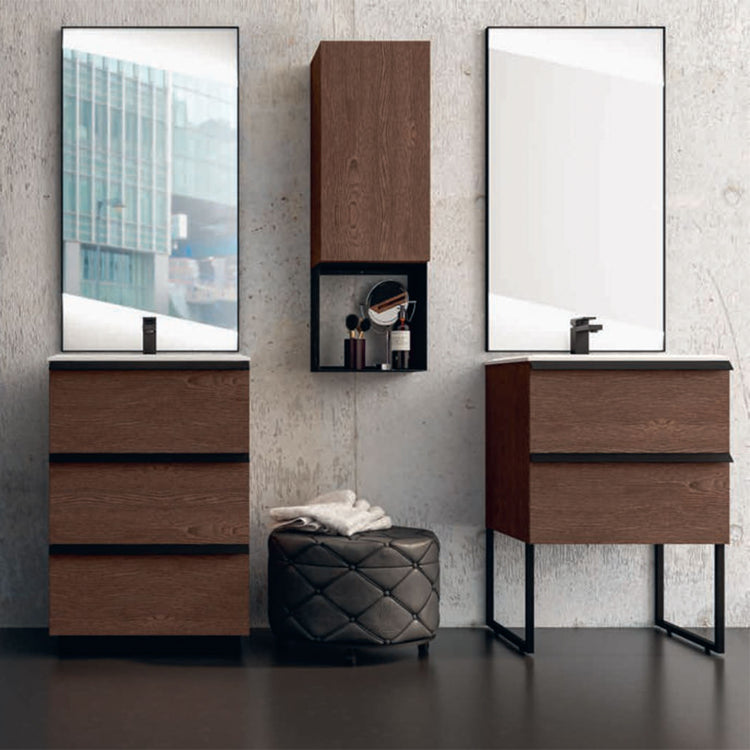 Available in two wood finishes, Bruges Oak and White Rock, the Collection is based on the simplicity of the lines enhanced by 45-degree gleanings and the functionality of the countertops, available in wood or metal finish with the practical side accessories. The cubes in black plate and the wooden wall units, combined with the profiled metal mirrors with integrated double LED, complete the Qubo line, giving it the dynamism and versatility of the industrial style.