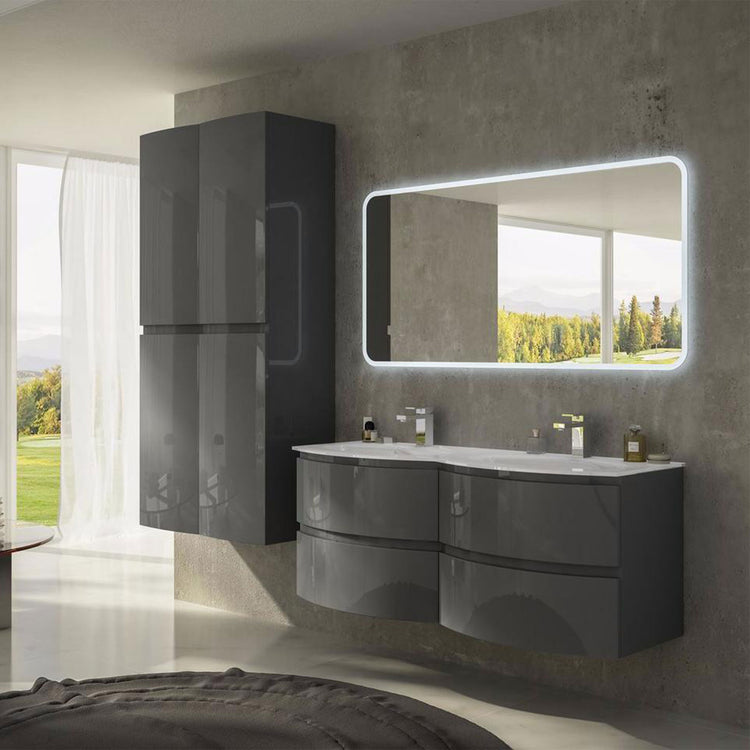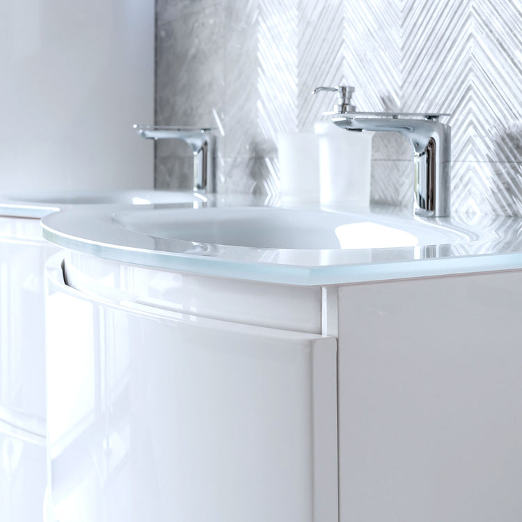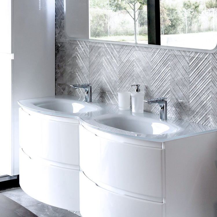Exterior doors and central drawers with self-braking closing system for a bathroom concept centered on the rationality of the shapes and the practicality of the use.