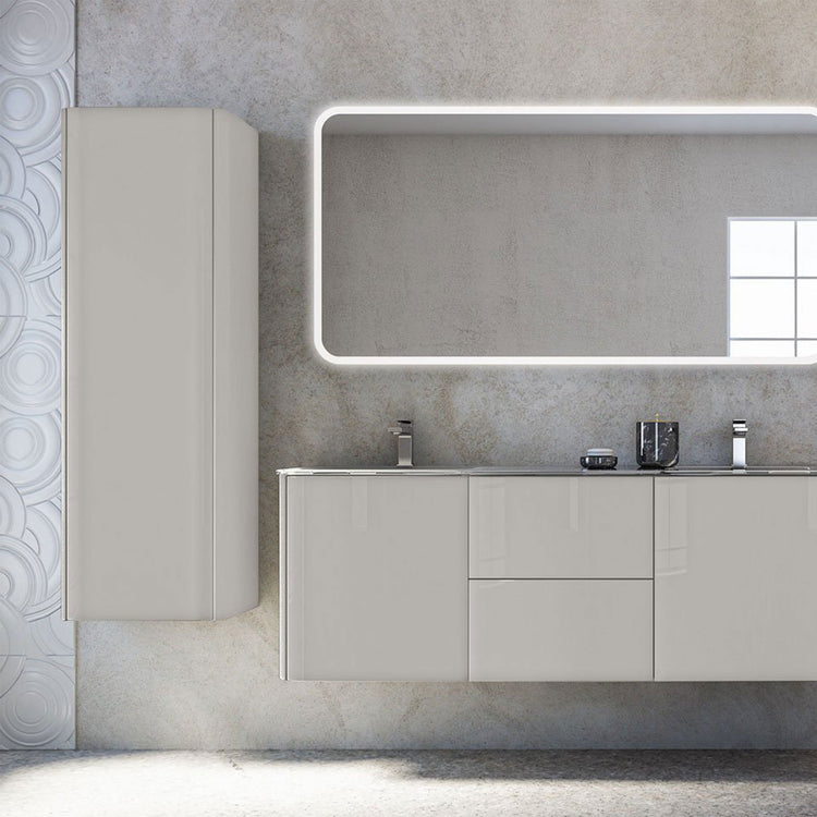New design and functionality for the collection Liverpool: a containing furniture with rounded sides that follow the radius of the extra-light glass basin, multifunction drawers with practical push-to-open system and soft-closing system in which technological function and aesthetic component are wisely merged.