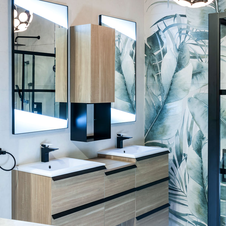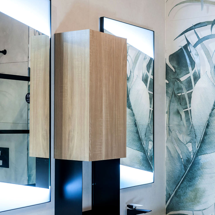 The perfect modularity of this line allows you to create infinite combinations by combining the drawers, equipped with slow closing and practical metal handles, plinths or feet in black sheet metal, typical of the industrial chic taste. The Collection is based on the simplicity of the lines enhanced by the 45-degree edges and the functionality of the shelves, available in wood or metal finish with the practical side accessory holder. The cubes in black sheet metal and wooden wall units, combined with the profiled metal mirrors with integrated double LEDs, complete the Qubo line, giving it the dynamism and versatility of an industrial style.