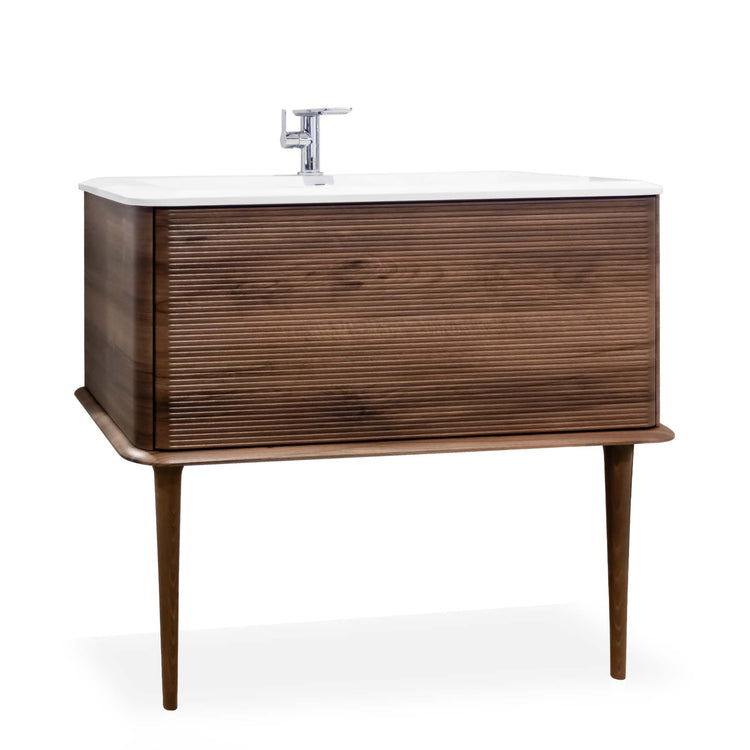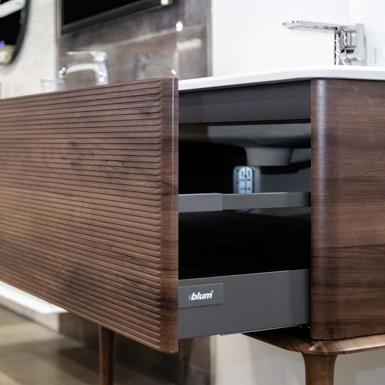 The Idra Collection was born from the concept of a bathroom environment in which the typical elegance of classic design is reinterpreted in a modern key with elements of strong stylistic connotation capable of giving a new light to the panorama of bathroom furnishings. Timeless elegance and contemporary rigor come together in a game of contrasts between curved lines and 3D geometries for a versatile and refined Collection. Available in the hanging version or with solid wood feet, the Collection has sides with finely rounded edges that welcome fronts with horizontal fluted decoration in a vast range of nuances and sizes.