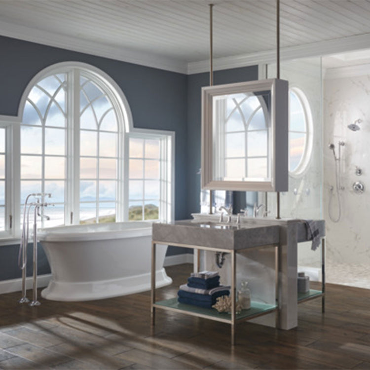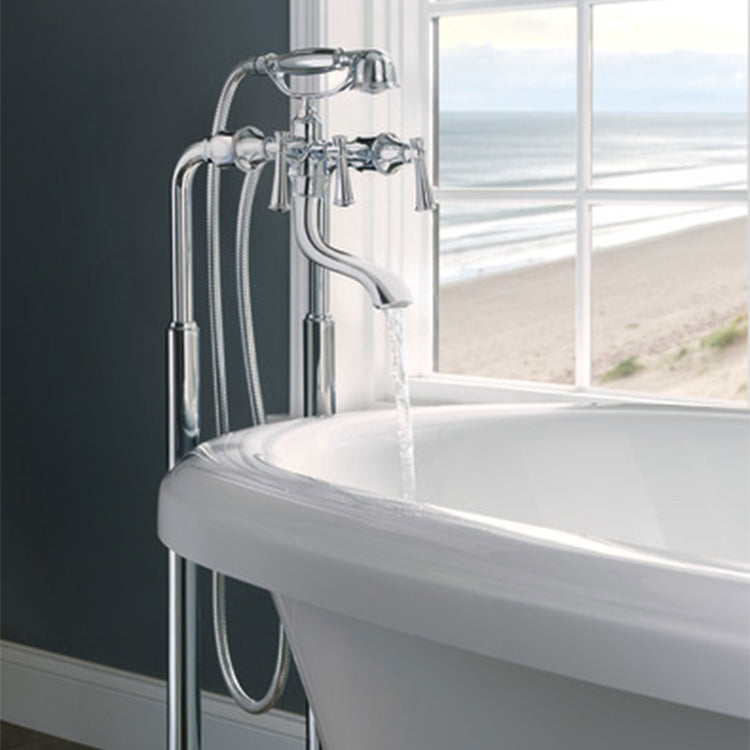 Drawing inspiration from the timeless beauty of lighthouses, the Baliza® Bath Collection features a unique architecture and simple, elegant lines. The two-handle freestanding tub filler can be configured for wall mount, deck mount or floor mount installations. For floor mount installations only, a rough (sold separately) is required.