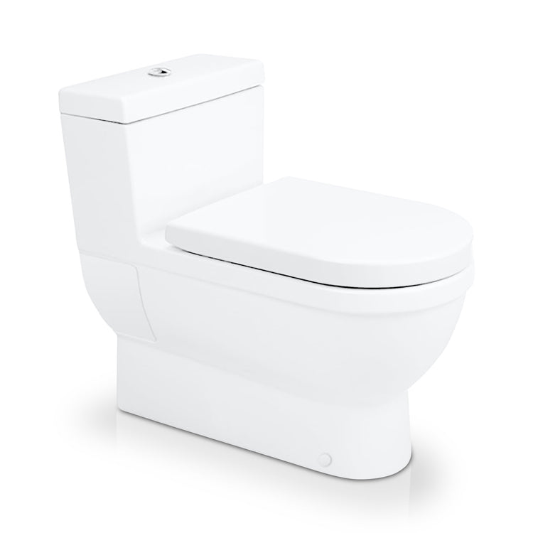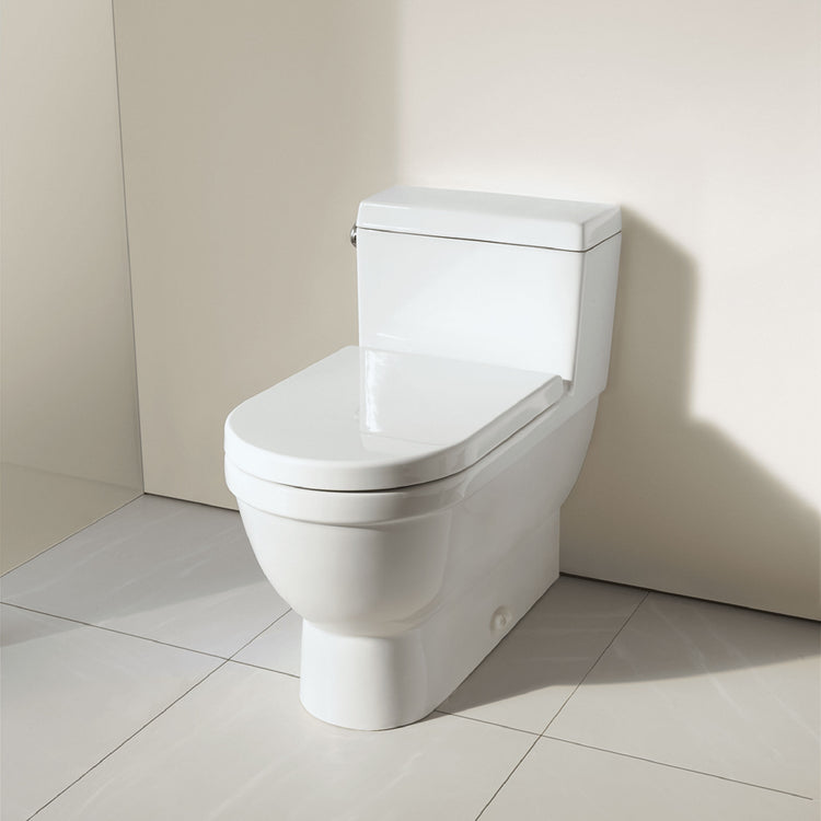 US-version, elongated with syphonic jet action, 305 mm/12" rough-in, with Single Flush mechanism, with side lever, 3"/80 mm flapper valve, vertical outlet, 1,28 gpf (4,8 lpf)