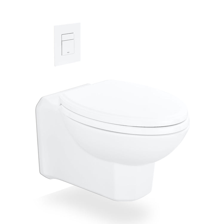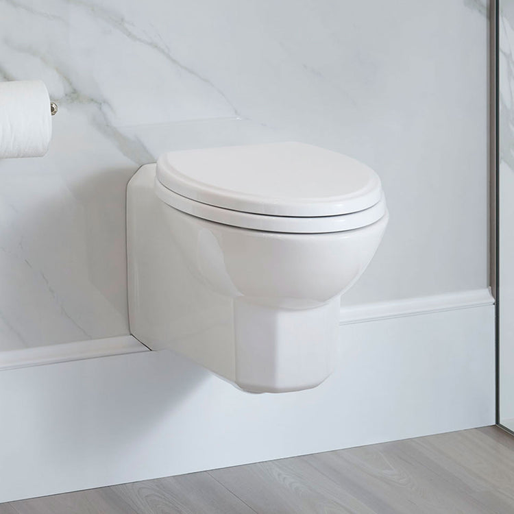 The Belshire Wall-Hung Dual Flush Toilet from DXV complements the Belshire Collection, calling to mind the glamour and sophistication of the Art Deco period. To the discerning homeowner, there is no mistaking the exceptional engineering inherent in this dual-flush design that allows for maximum water conservation without sacrificing superior performance. From its minimalist wall-mount design, smooth sides, and ultra-high efficiency, this DXV Belshire Toilet exceeds expectations in both form and function.