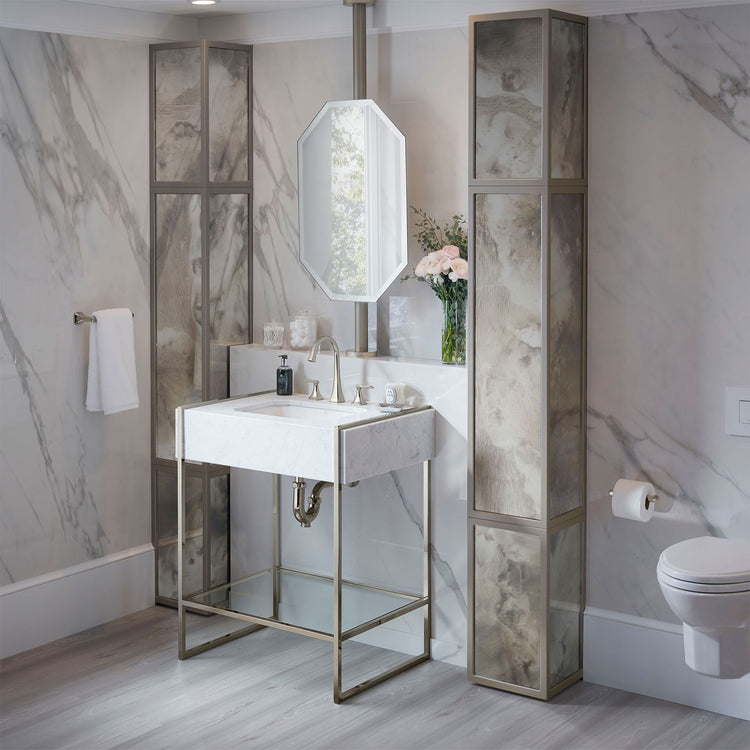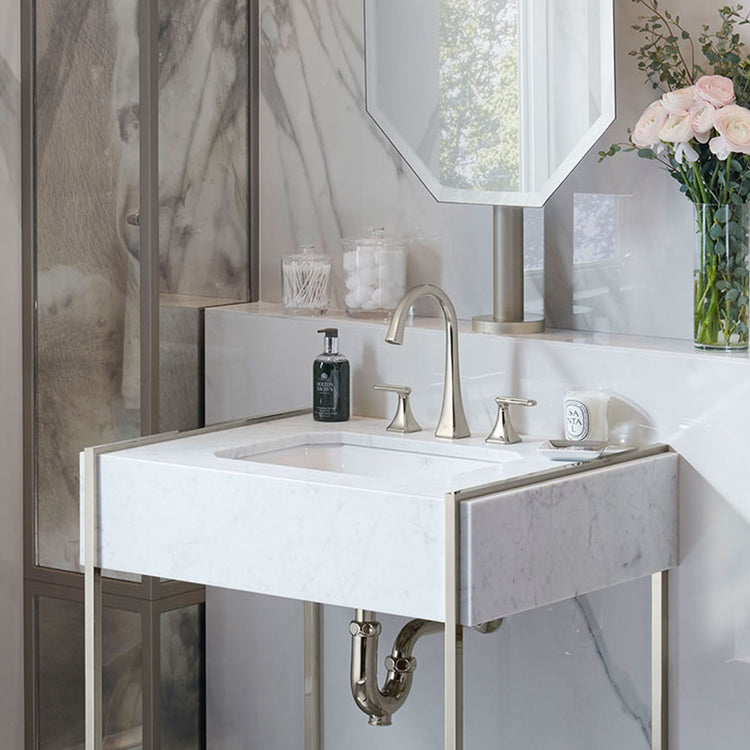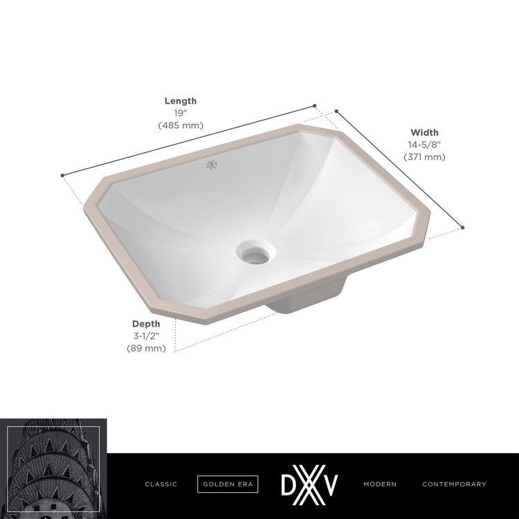 The Belshire Undermount Sink from DXV complements the Belshire Collection perfectly. Detailed with faceted corners that slope gracefully to the center, this high-gloss sink reflects the glamour of the Art Deco period and the unique luxury of the Belshire aesthetic.