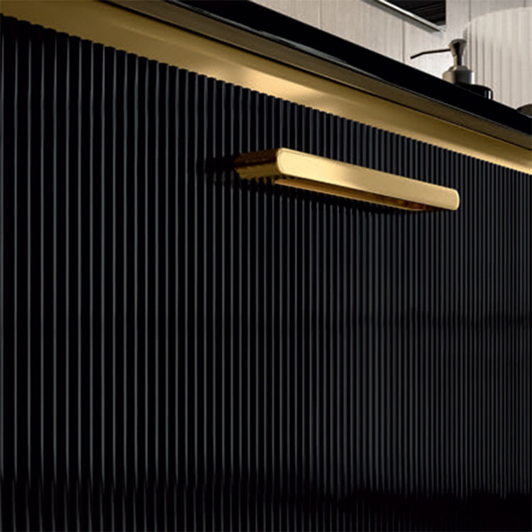 The beauty of the fronts with raised texture distinguishes LAMÈ collection. Six different geometrical patterns available in a wide variety of finishes. Details chrome and gold define the volumes of this new concept.