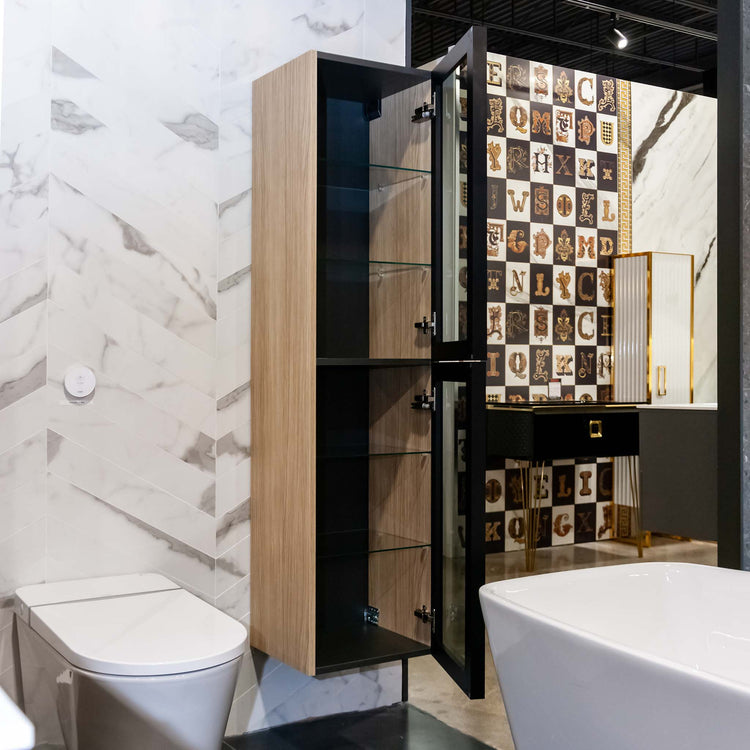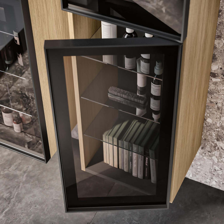 The Class bathroom furniture line is a modular line that stands out for its iconic doors. It has an aluminium frame featuring an insert available in different materials and finishes. This frame has a dual function: aesthetics and practical.