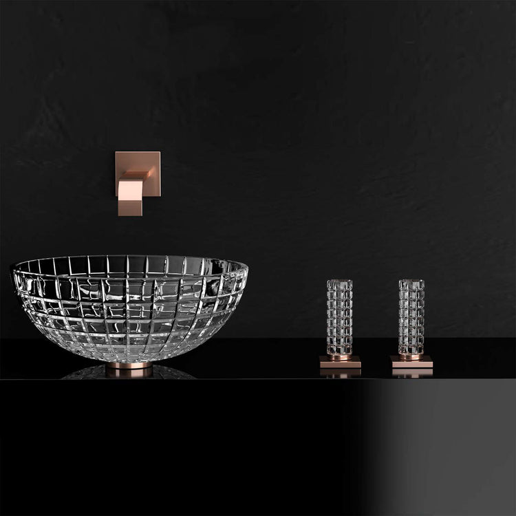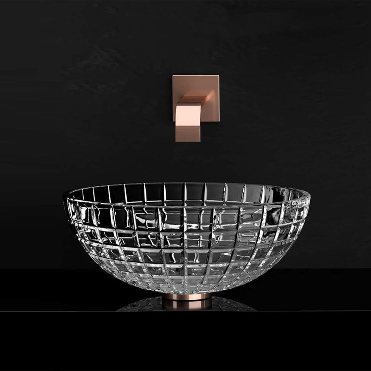 LUXOR ROUND countertop washbasin in the purest clear crystal 24% pb, hand beveled in stone. An exclusive diamond cut, classic geometries repeat, leading to a magnificence display of light architecture.