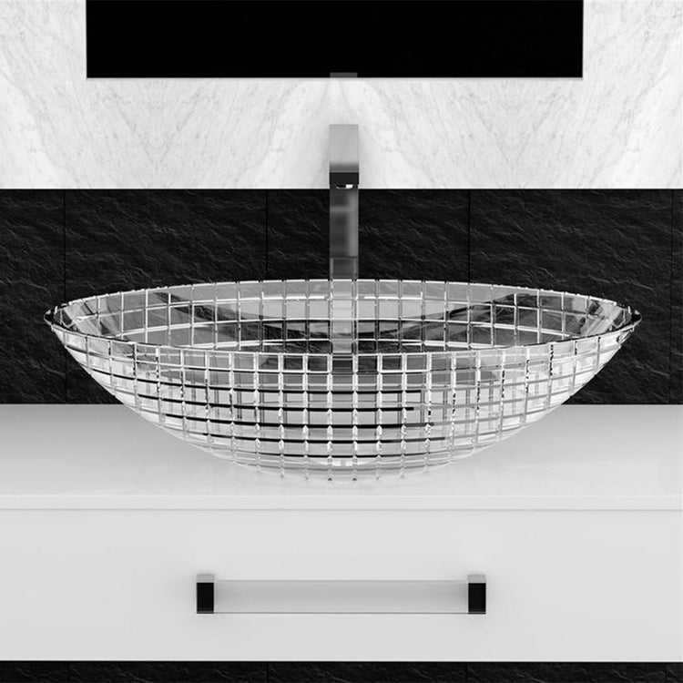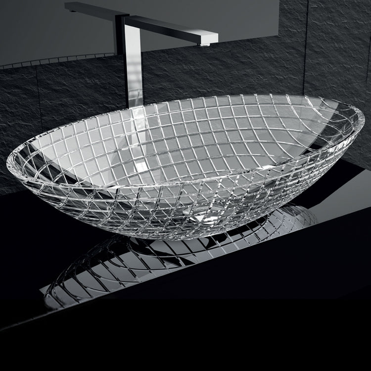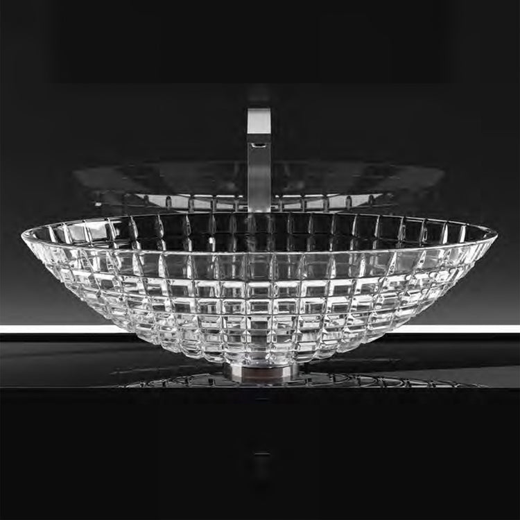 LUXOR OVAL countertop washbasin in the purest clear crystal 24% pb, hand beveled in stone. An exclusive diamond cut, classic geometries repeat, leading to a magnificence display of light architecture.