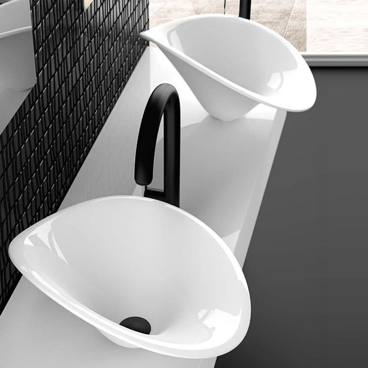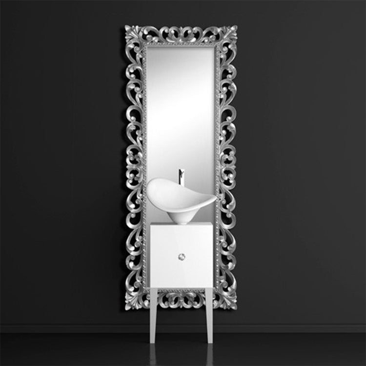 Unique like the concept that has inspired it, the Monnalisa composition aims to make the bathroom a unique room, optimizing the spaces and enriching them with sensations. The Prestige – Flower series combines perfectly the floral shape of the FLOwer washbasin to the frame design, reminded also from the exclusive glass knob. White and platinum: the cold white contrasts the sober platinum warmth. A sober but precious union. The composition includes: vanity unit with knob, mirror, washbasin with drain and base ring.