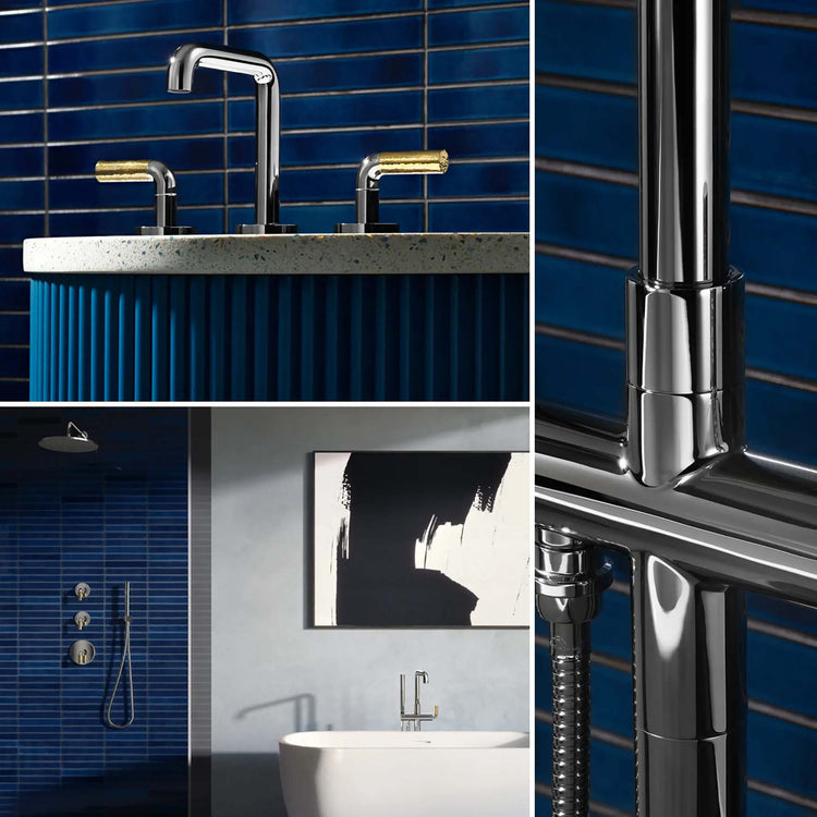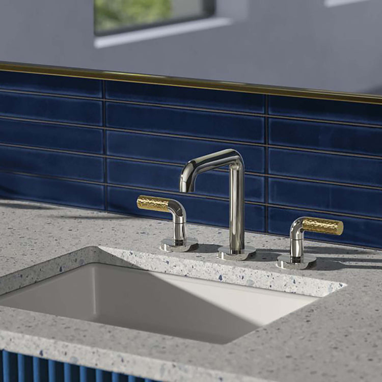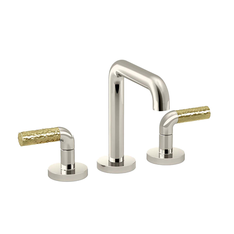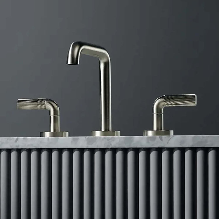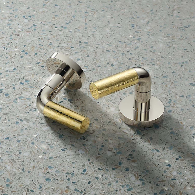 With sleek form and distinctive details, the premium bathroom sink faucet by the One Decorative collection makes a statement in any modern bathroom. Hand-hammered P.E. Guerin handles bring rich detailing to the faucet's minimalist beauty.