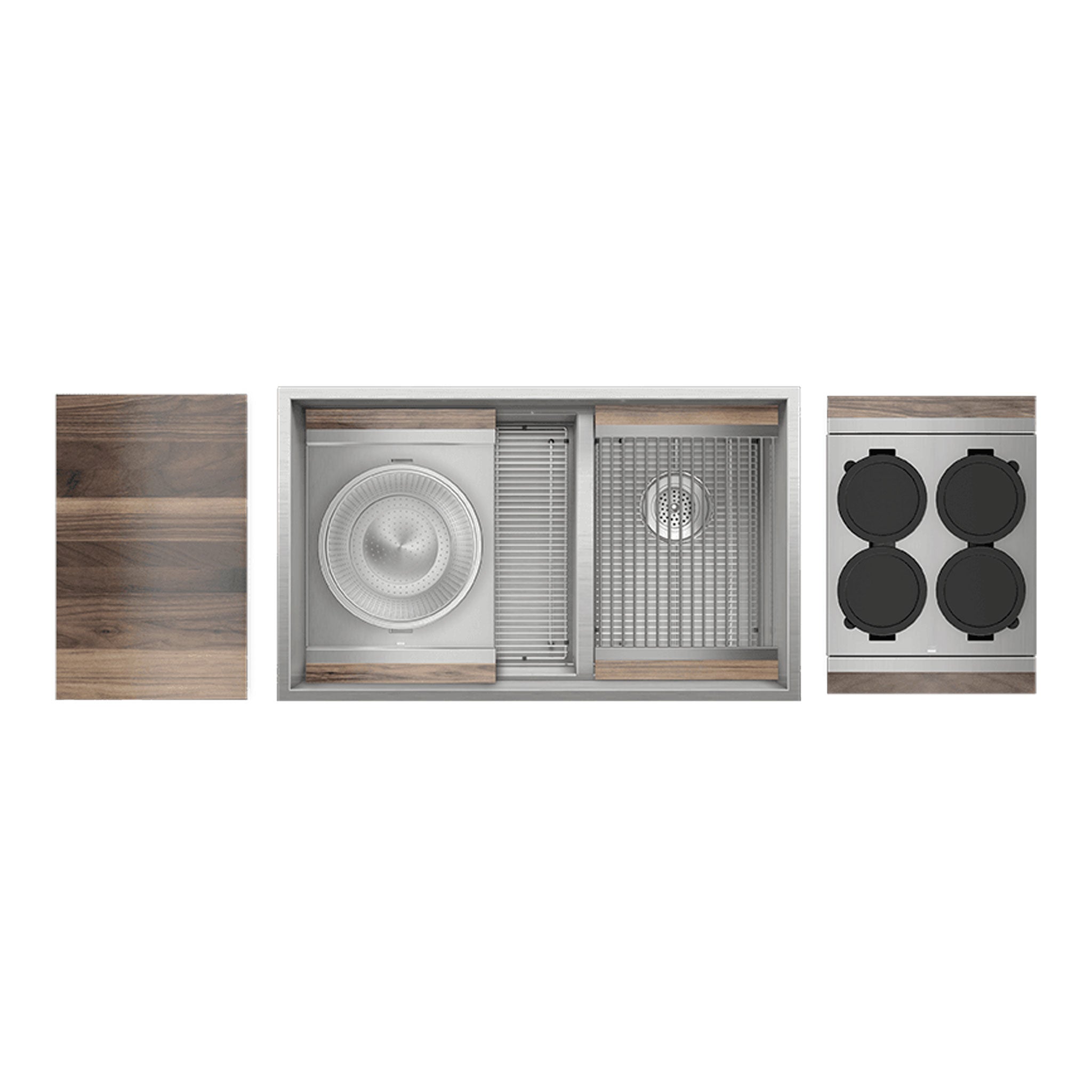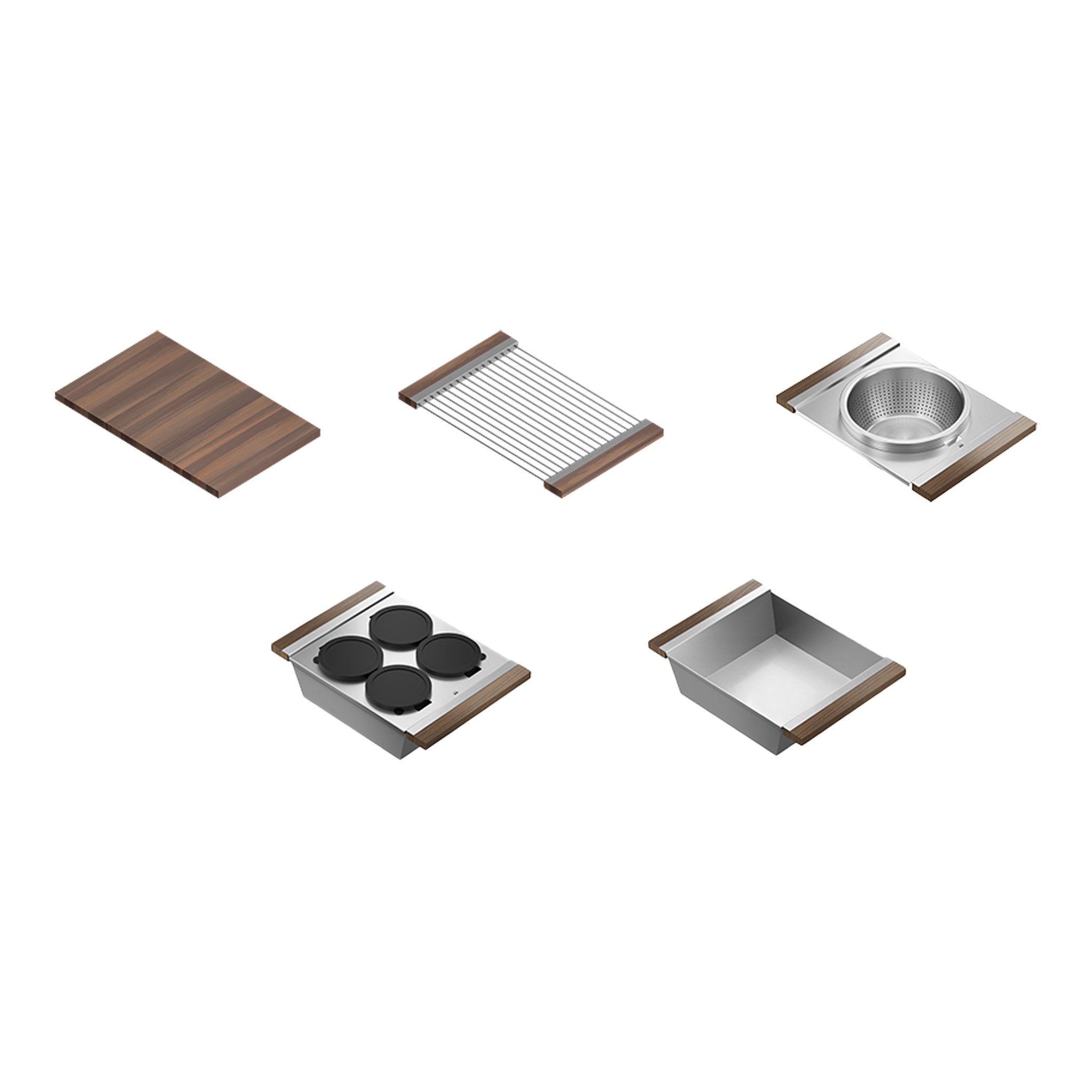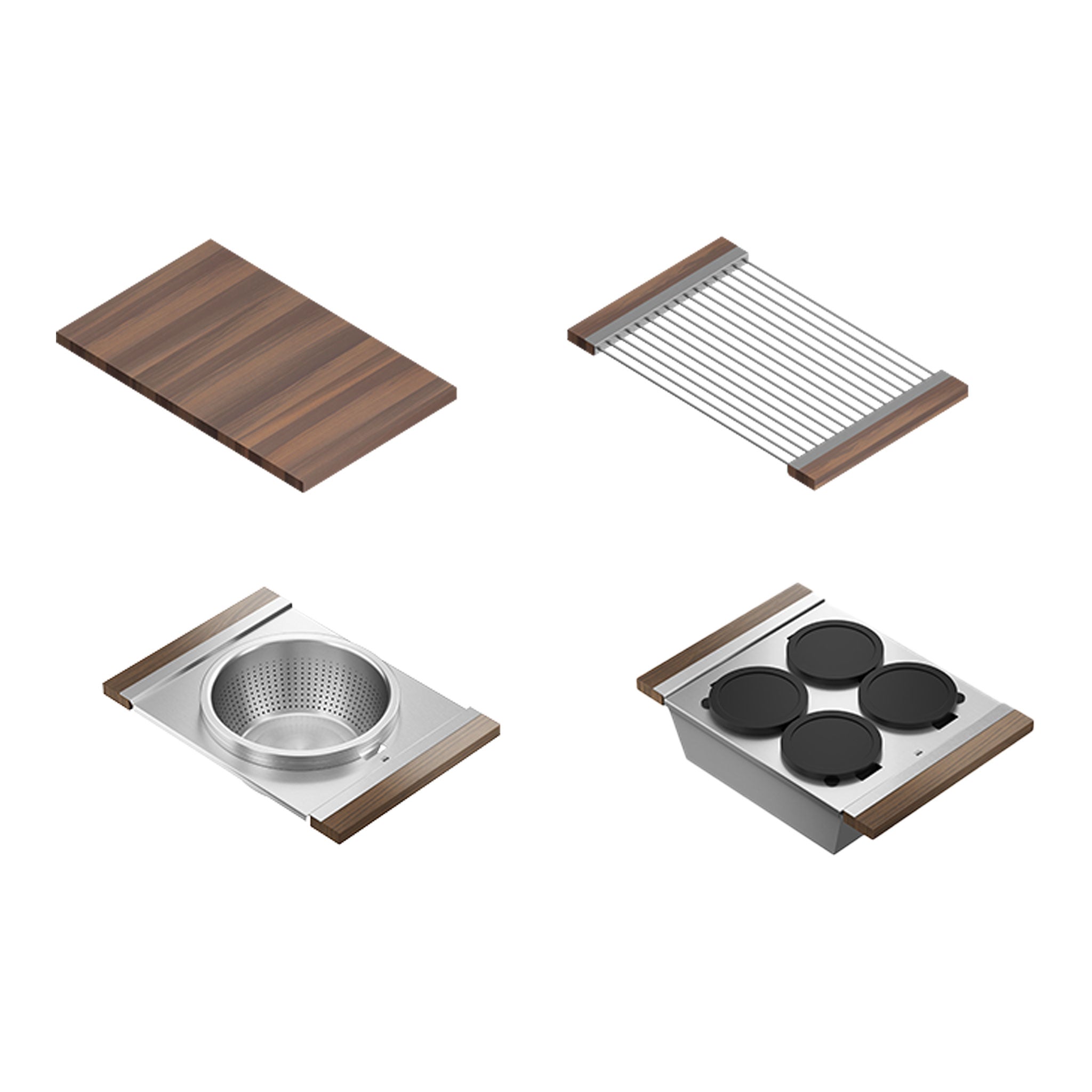 - SET INCLUDES: Sink, bottom grid, cutting board, mixing bowl and strainer set, stainless steel strainer, mounting hardware and cutout template.