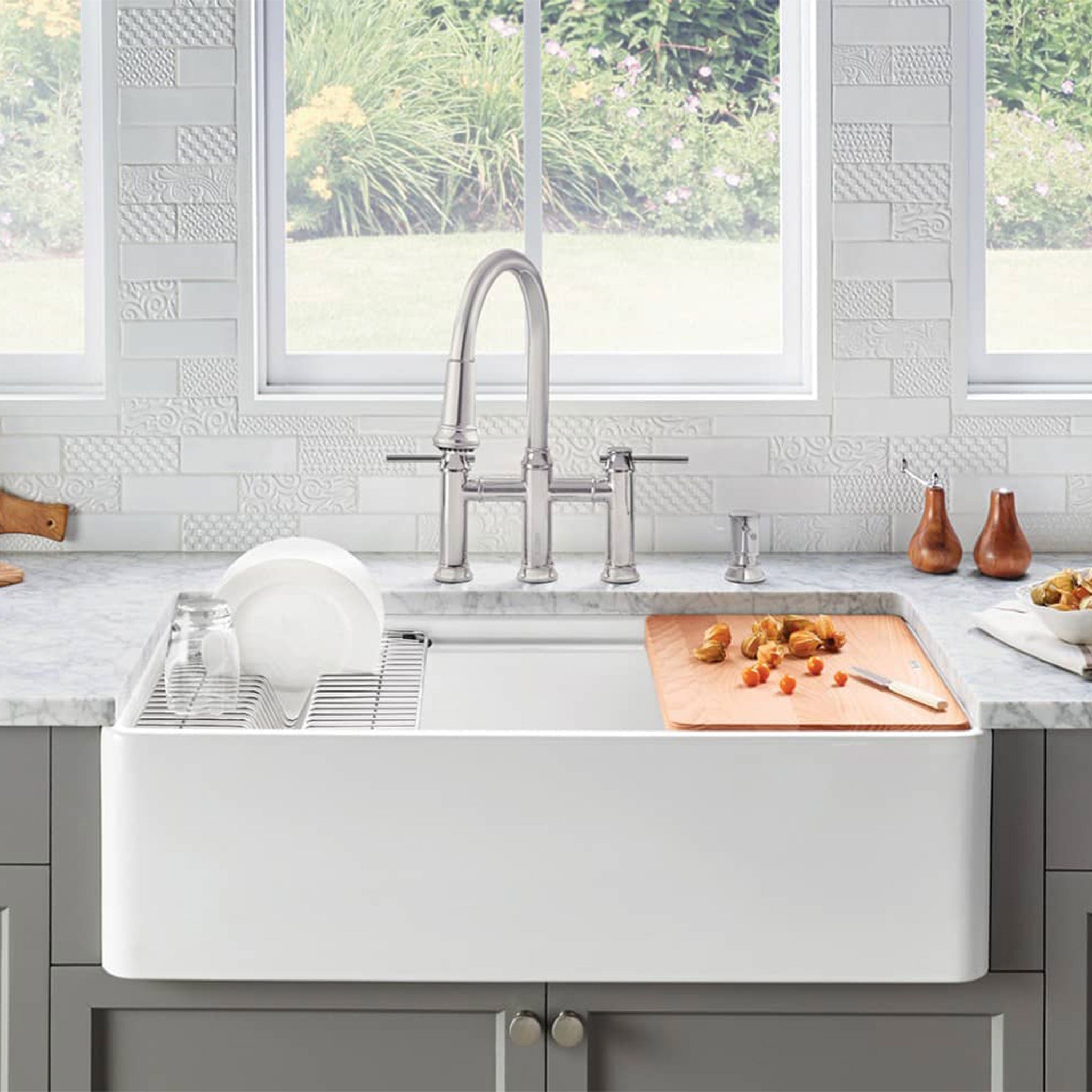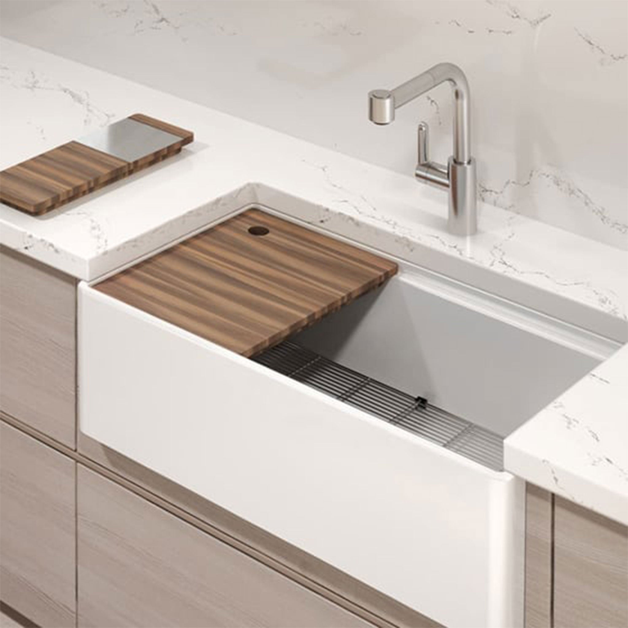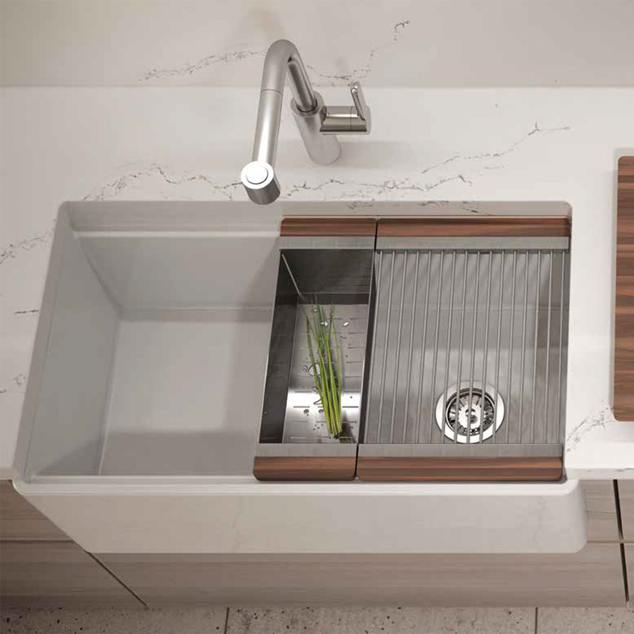 - SET INCLUDES: Sink, bottom grid, cutting board, mixing bowl and strainer set, stainless steel strainer, mounting hardware and cutout template.
