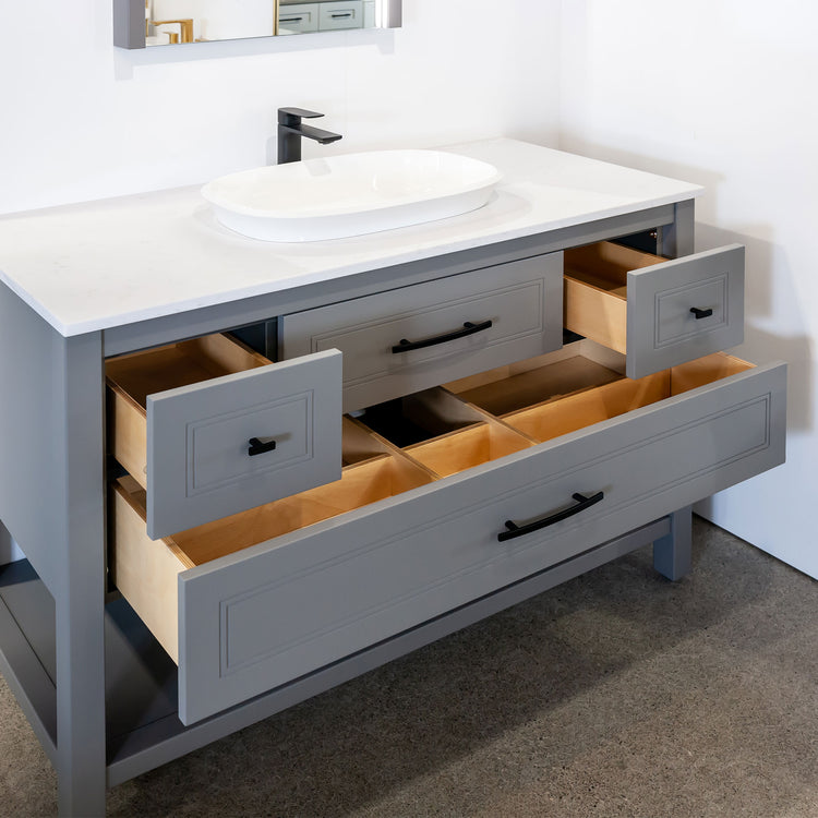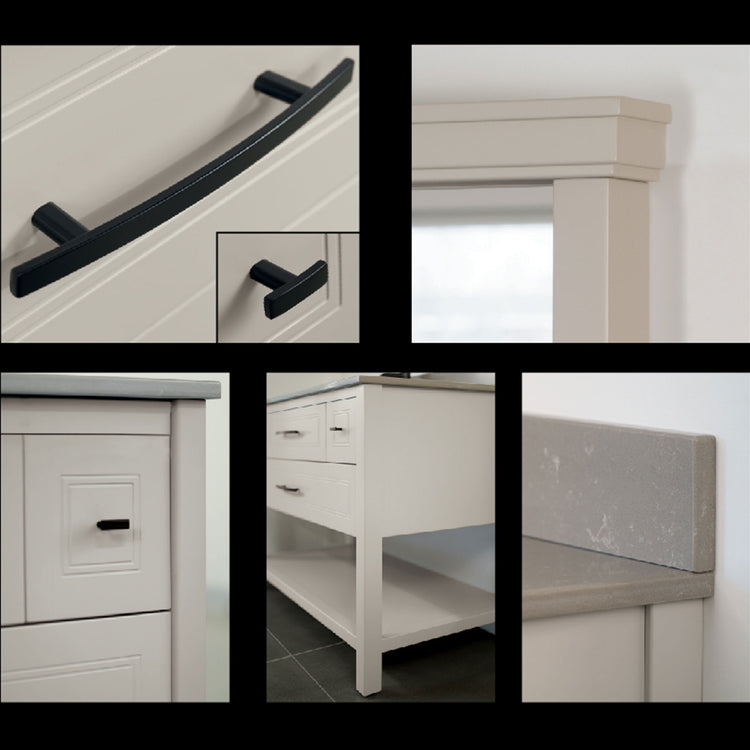 Highly customizable, the collection adapts to all tastes thanks to its materials choices (wood or satin lacquer), sinks (undermount or vessel), backsplash shapes and handle finishes.