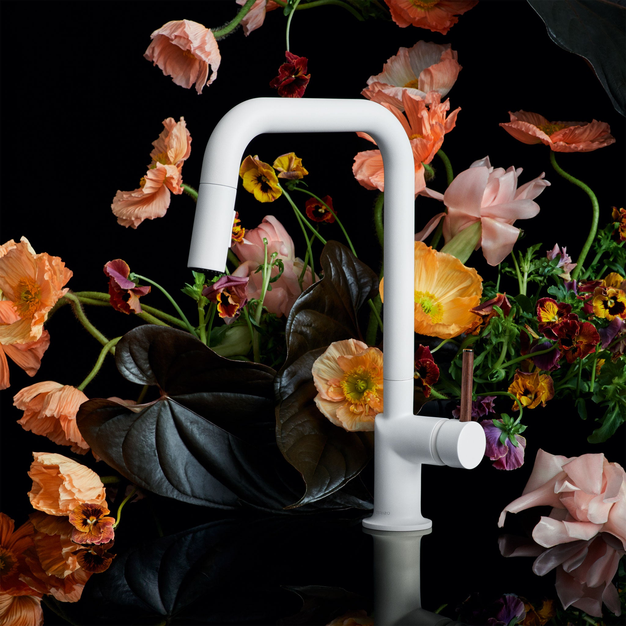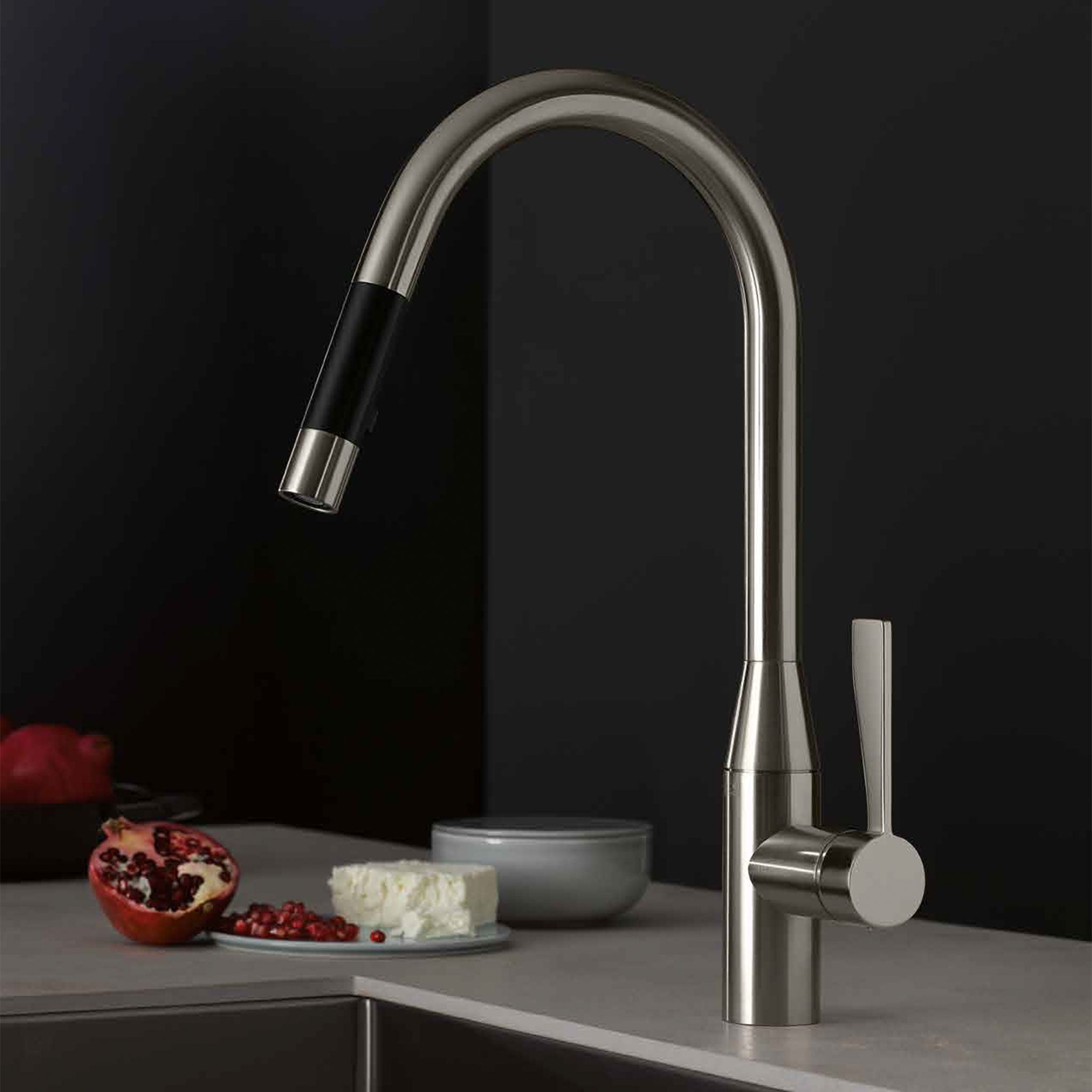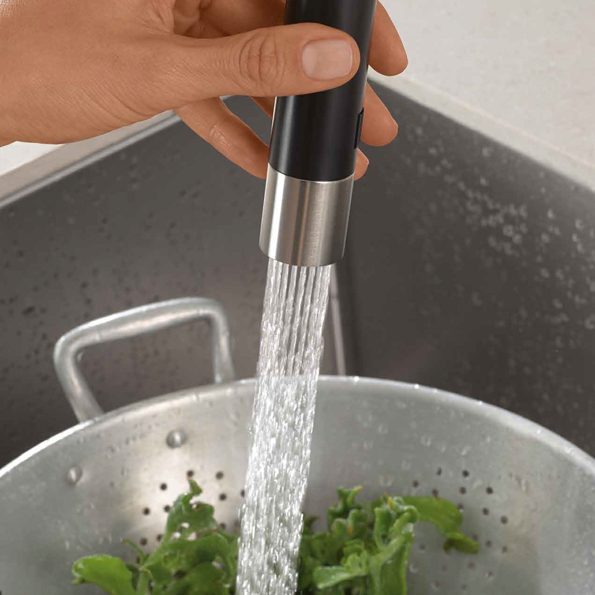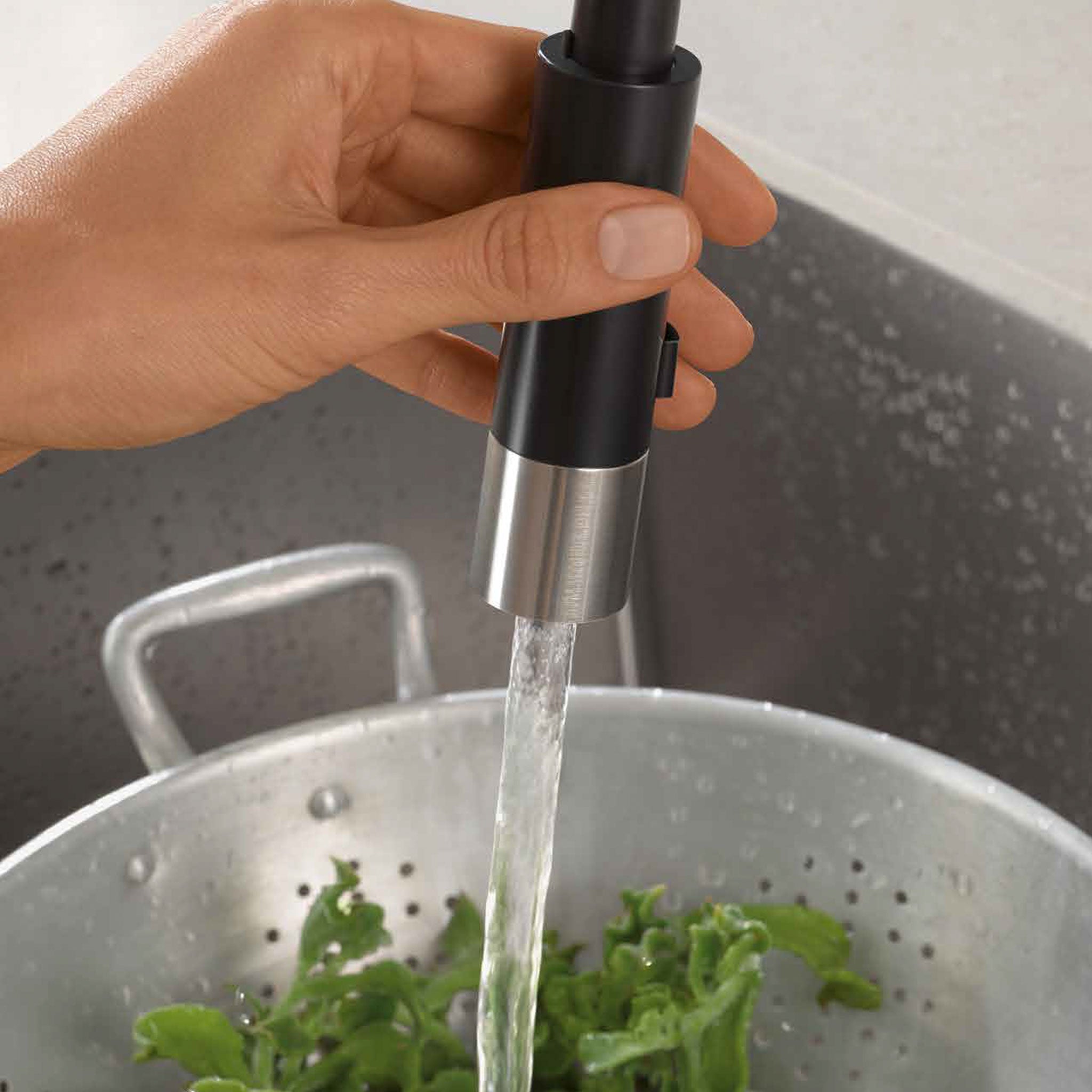 - Counterbalanced weight on spray hose allows smooth pull out and prevents snap back.